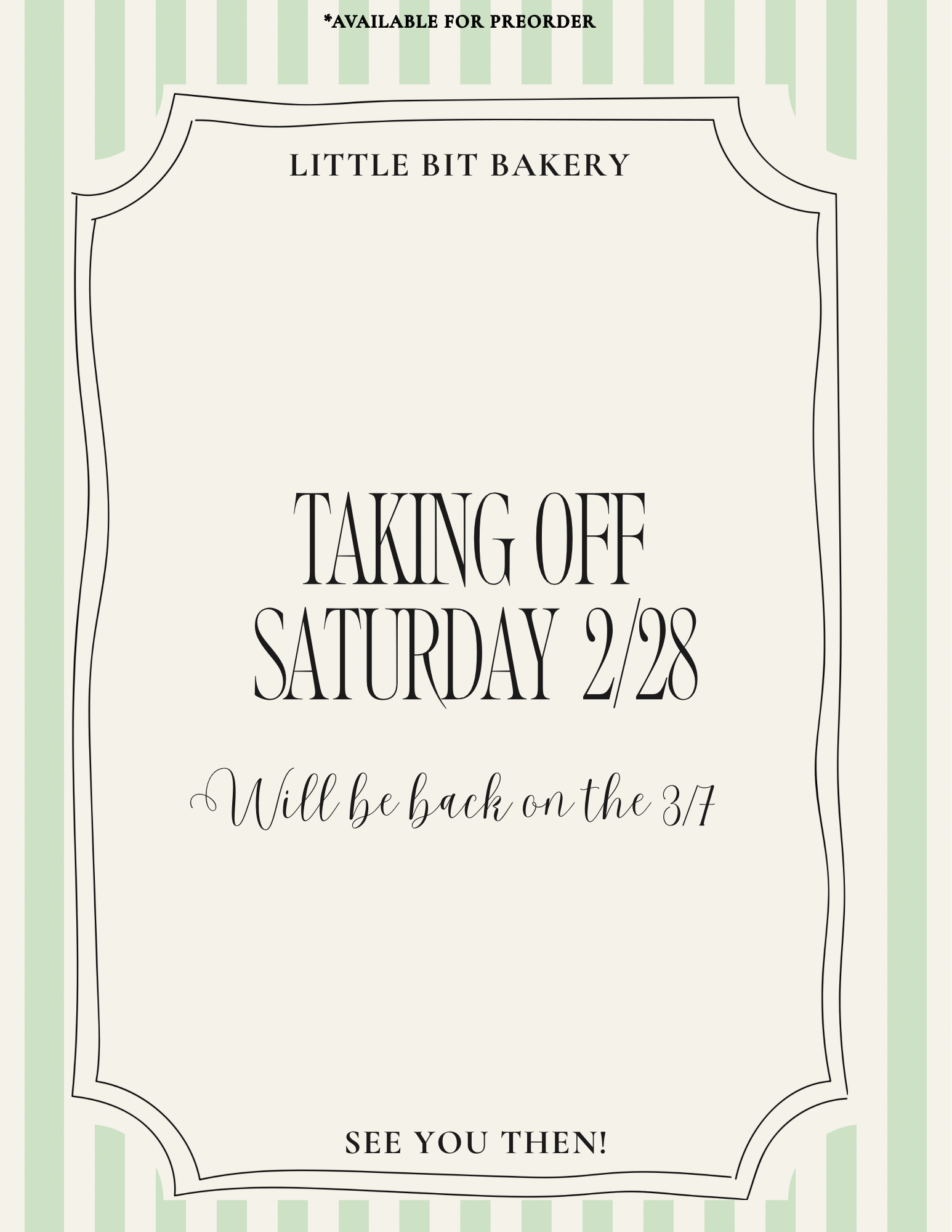 There will be no porch bakery 2/28 but I will be back at it on 3/7! Preorders will open on 3/1 for that Saturday.