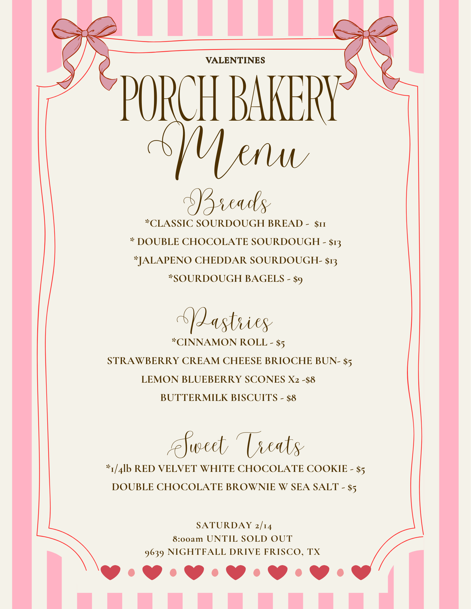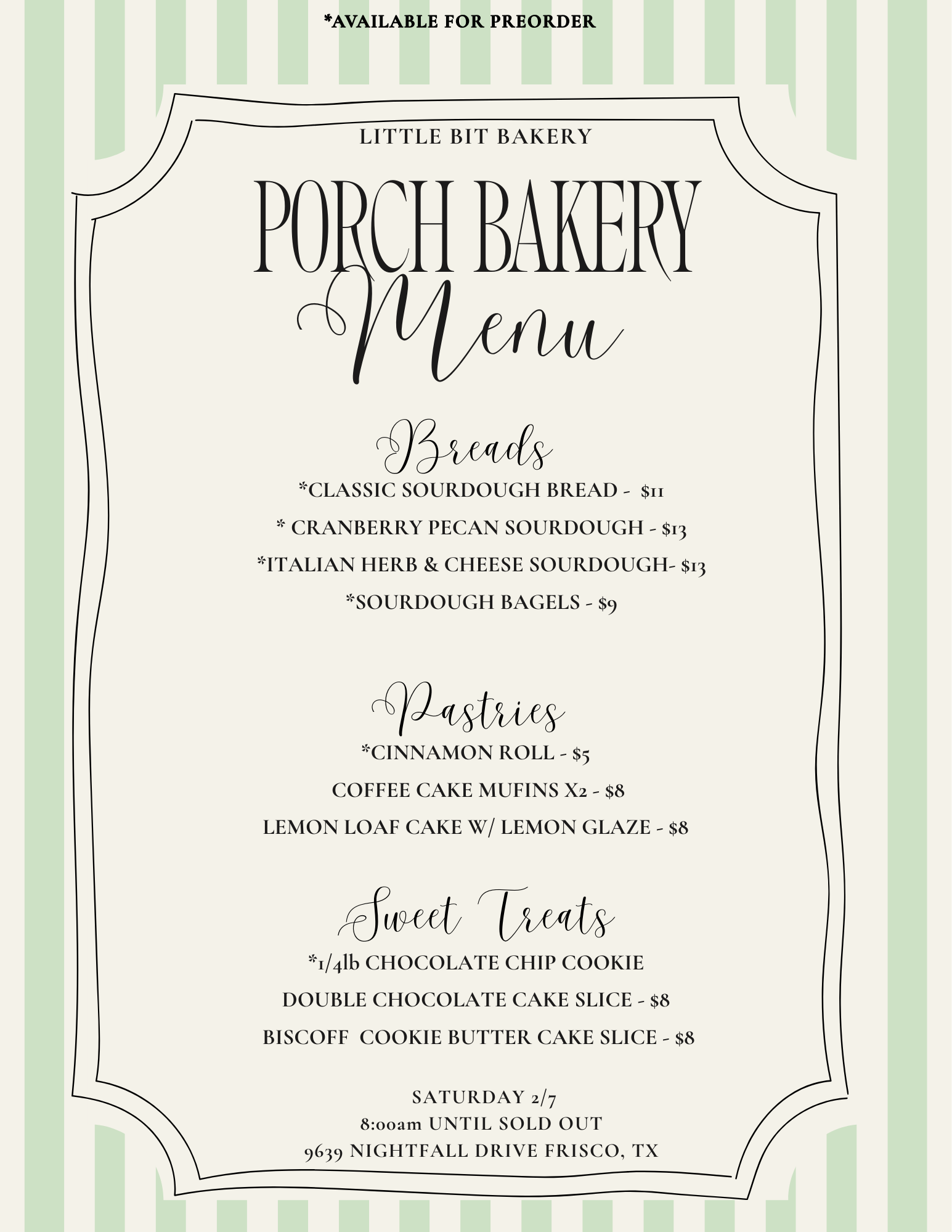 The porch bakery will be back and at it on 2/7! Feel free to take a look at the weekly menu. Thank you everyone for the support!